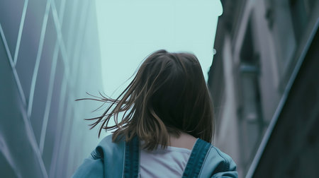 A young woman with dark, curly hair stands facing the camera. Stripes of light and shadow form patterns on the wall. The setting appears urban and modern.