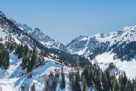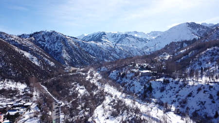 Winter Snowy Mountains valley with sun in Ak Bulak, Almaty, Kazakhstan, Asia