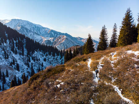 A man with a backpack walks in winter in a mountain gorge by the river. Alma-Arasan gorge. Alma-Ata's region. Kazakhstan
