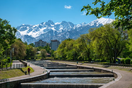 Almaty, Kazakhstan - MAY 5, 2019: Morning on the Esentai River Vesnovka overlooking the snow-capped peaks of the mountains of Zailiysky Alatau. Almaty city. Kazakhstan