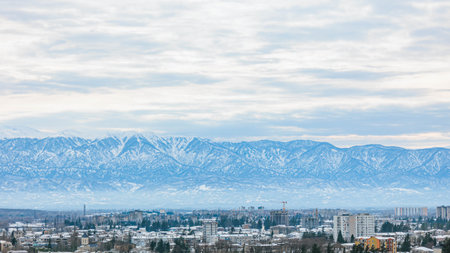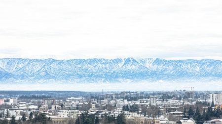 Scenic winter panorama of Kutaisi, Georgia. Snow-covered buildings and rooftops with the dramatic Caucasus Mountains in the background under a cloudy January sky. Beautiful seasonal cityscape