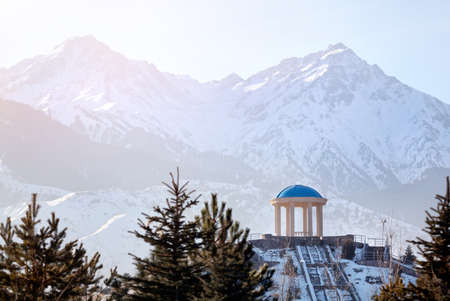View to the monument with stairs at snow mountains background in dendra park of first president Nursultan Nazarbayev in Almaty, Kazakhstan