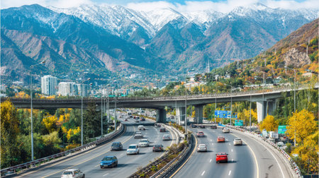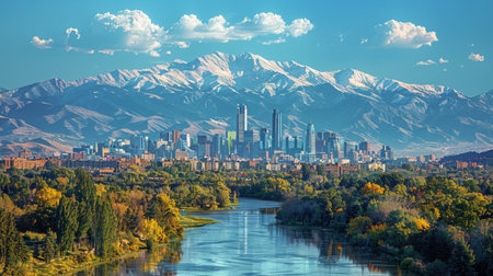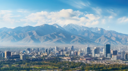 A city nestled amidst towering mountains in the background, showing urban and natural landscapes merging seamlessly.
