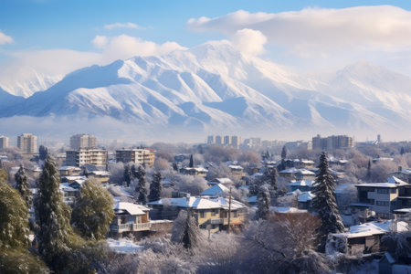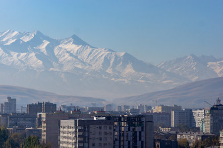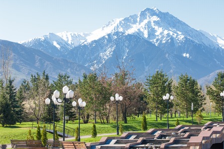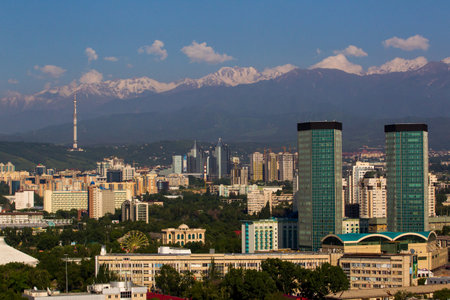 City landscape on a background of snow-capped Tian Shan mountains in Almaty Kazakhstan