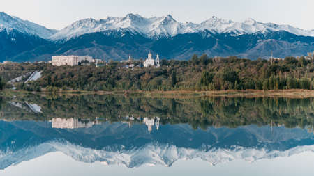 View of the mountain from Lake Sairan in the city of Almaty