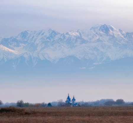 The Church in honor of the icon of the Mother of God, the Life-Giving Spring, the village of Cosmos in the Almaty region of Kazakhstan against the backdrop of snowy mountains.