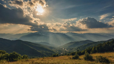 Panoramic photograph of the top mountain peak in Valjevo, Serbia, with the Dinaric Alps mountain range in the background, on a sunny day. Captured using a Hasselblad X2D wide-angle lens, with sharp focus and professional color grading. The image has a clean, cinematic aesthetic with minimal contrast, emphasizing the natural beauty of the landscape. --ar 37:15 --v 6.1 Job ID: 12cf8b59-275c-4497-beeb-ec5cd27ac780