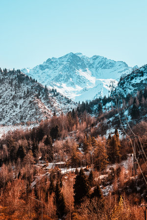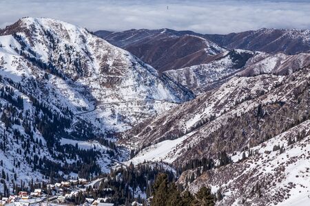 Zailiyskiy Alatau mountain range, Shymbulak ski resort, Almaty, Kazakhstan. Natural landscape with road up mountain, power line, rocky slopes covered with snow and trees