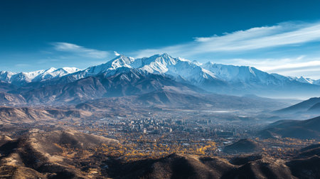 Landscape snow-capped mountains over Almaty in the morning