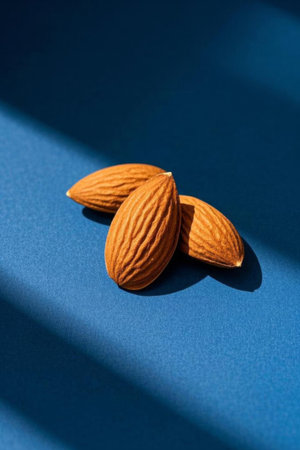 Almond nuts on a blue background with a shadow from the sun