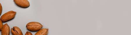 Fresh pecan nuts in shell on gray background with copy space