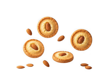 Five almond cookies floating with almonds isolated on transparent background