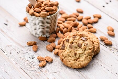 Almonds nuts on table cloths background / almond cookie for breakfast health food