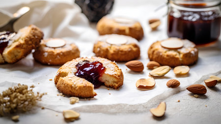 Almond cookies with jam on a white background. toning. selective focus