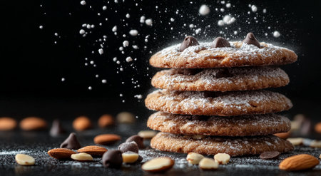 A stack of freshly baked chocolate chip cookies is topped with powdered sugar. Surrounding the cookies are almonds and chocolate chips, all set against a dark backdrop.