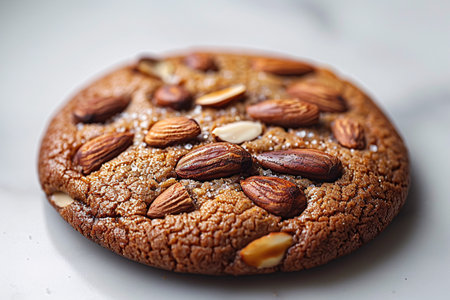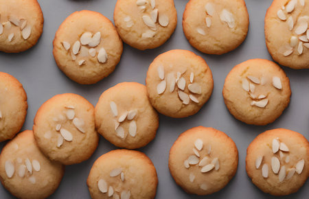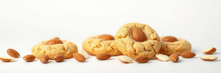 Delicious almond cookies arranged artfully with scattered almonds on a white background