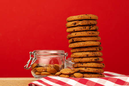 Chocolate chip cookies in stack on red background