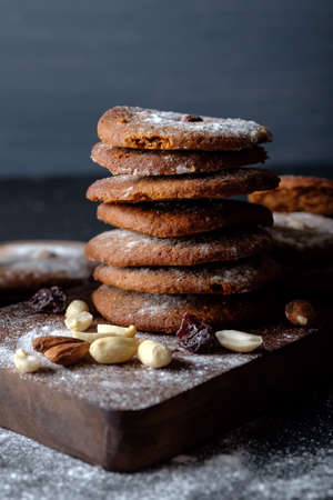 Chocolate cookies with nuts on a wooden board. Selective focus.
