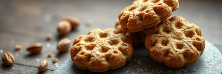 Delicious homemade cookies arranged on a rustic wooden table with nuts scattered around