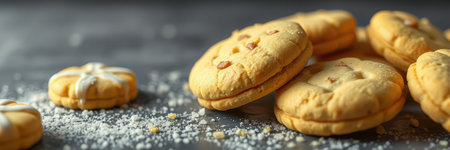 Freshly baked cookies arranged on a dark surface with powdered sugar and decorative patterns in warm lighting