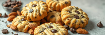 Delicious freshly baked cookies with chocolate chips and almonds on a gray surface