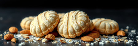 Freshly baked cookies and almonds placed on a dark surface with powdered sugar sprinkled around