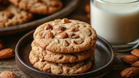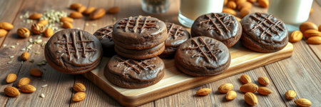 Freshly baked chocolate cookies served with milk and almonds on a rustic wooden table