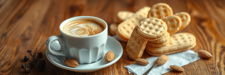Delicious coffee with waffles and almonds served on a wooden table in a cozy setting