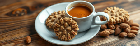 Warm coffee served with traditional cookies and almonds on a rustic wooden table