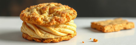 Delicious cookie sandwich with creamy filling and nuts enjoyed on a bright surface