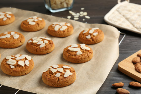 Tasty cookies with almond flakes on wooden table, closeup