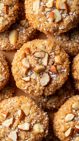 Overhead shot displays a stack of almond cookies featuring white sprinkles and almond pieces against a neutral surface, inviting a delicious treat.