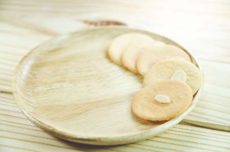 cookies with almond on a wooden plate on a brown background.