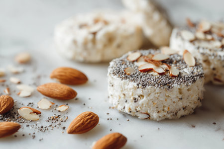 A delightful arrangement showcases rice cakes adorned with creamy almond spread and crunchy chia seeds against a soft lit marble background, perfect for a light snack or breakfast.