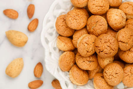 Amaretti-traditional Italian almond cookies in a white plate on a marble top view background. Amarettini biscuits close-up. Selective focus