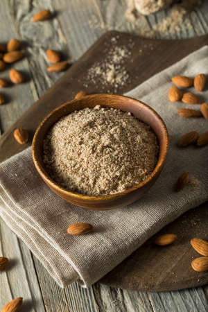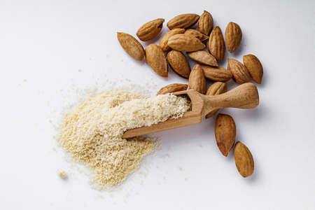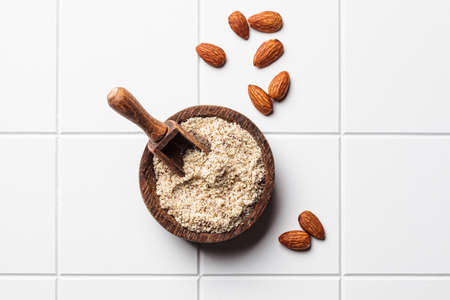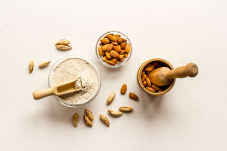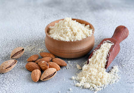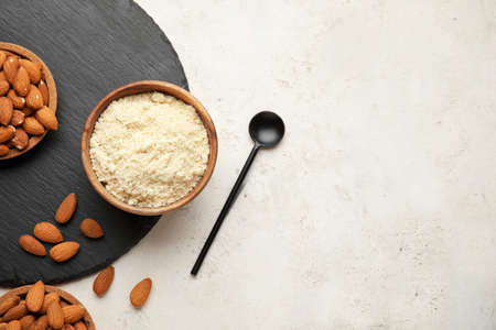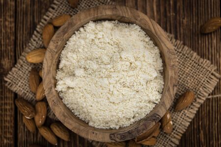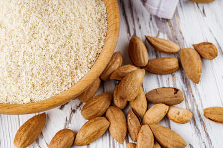 Almond flour in a wooden bowl, almonds on old light background. High quality photo