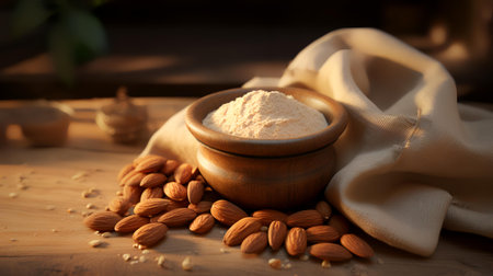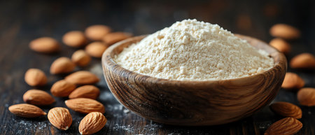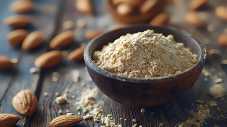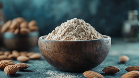 Almond Flour in Wooden Bowl, Surrounded by Almonds on Rustic Table, Healthy Baking Ingredient
