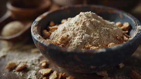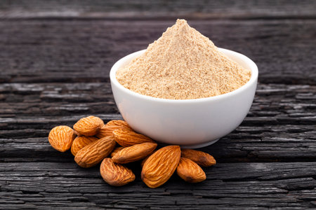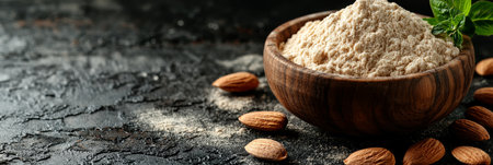 Almond Flour in Wooden Bowl on Dark Background Healthy Baking and Cooking Ingredient.