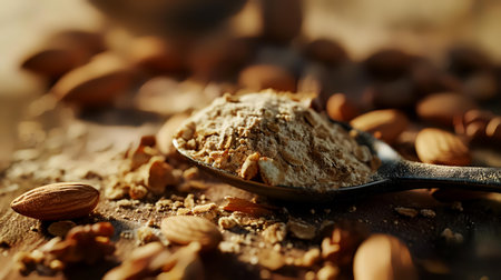 The beautiful ground almonds in a wooden scoop and with whole grains in the background are located on a dark surface