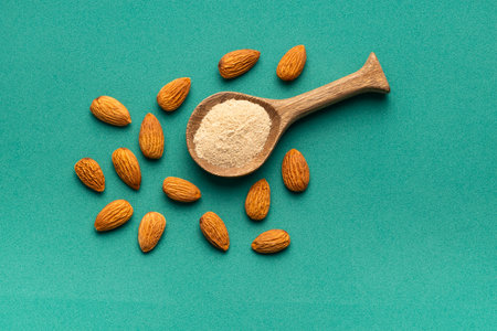 A wooden spoon overflows with almond flour, with several whole almonds nestled within the powder, creating a visually appealing image.