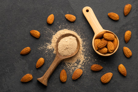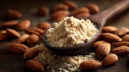 A close-up shows almond flour overflowing from a dark wooden spoon, surrounded by whole almonds scattered on a textured dark surface, highlighting the ingredients for healthy baking.