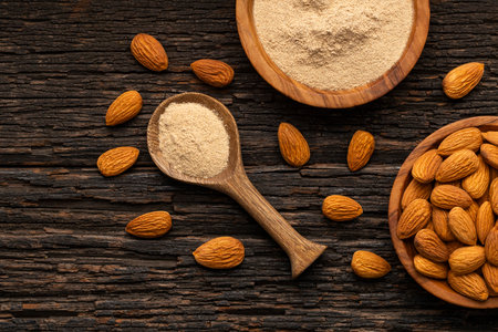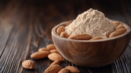 Almond flour in a wooden bowl surrounded by whole almonds on a dark rustic table healthy and rich