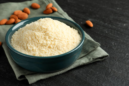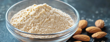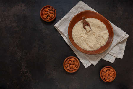 Almond flour in bowl. Nuts on table. Healthy food and products. Organic ingredients and vegan nutrition. . High quality photo