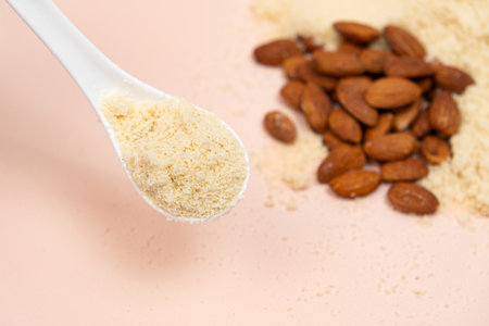 Almond flour in wooden brown spoon and nut kernels on pink powder background. Top view. Copy space