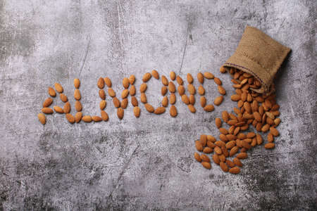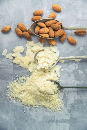 Almond flour in a stone bowl, almonds on old light background. High quality photo
