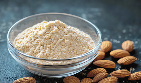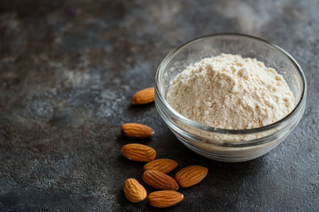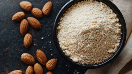 Almond flour in a glass bowl surrounded by raw almonds on a textured dark surface. Generative AI