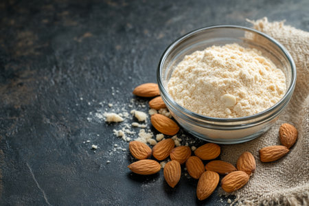 Almond flour in a glass bowl surrounded by whole almonds on a dark textured surface, beautifully arranged for a culinary presentation. Generative AI