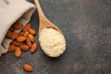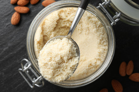 Spoon with fresh almond flour above jar and nuts on dark textured table, top view
