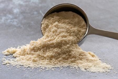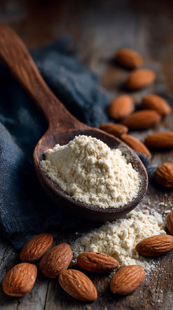 Close-up captures almond flour in a wooden spoon, spilled on a wooden surface with whole almonds. The composition features a rustic, natural food presentation with a linen cloth.