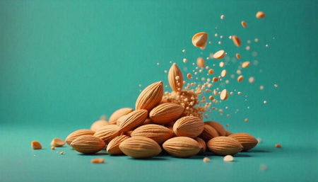 A captivating image featuring flour in a glass jar with a wooden spoon sprinkling flour. Surrounding almonds create a rustic kitchen scene, perfect for culinary inspiration.